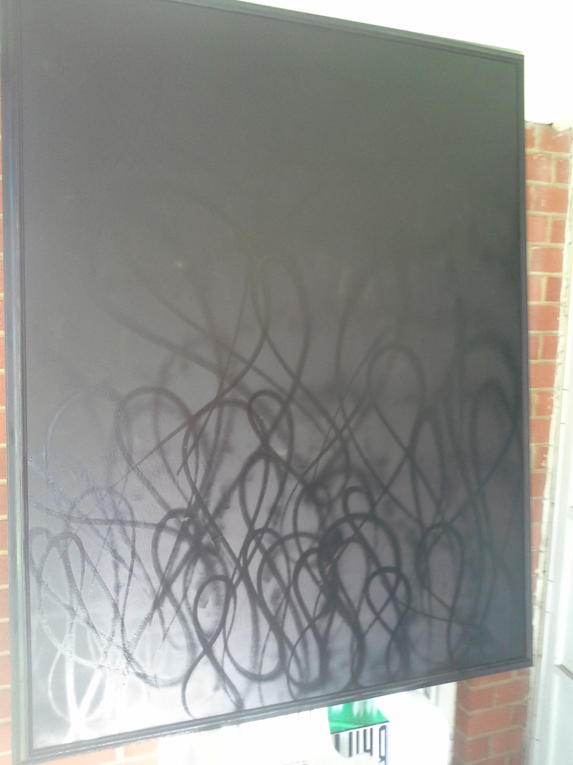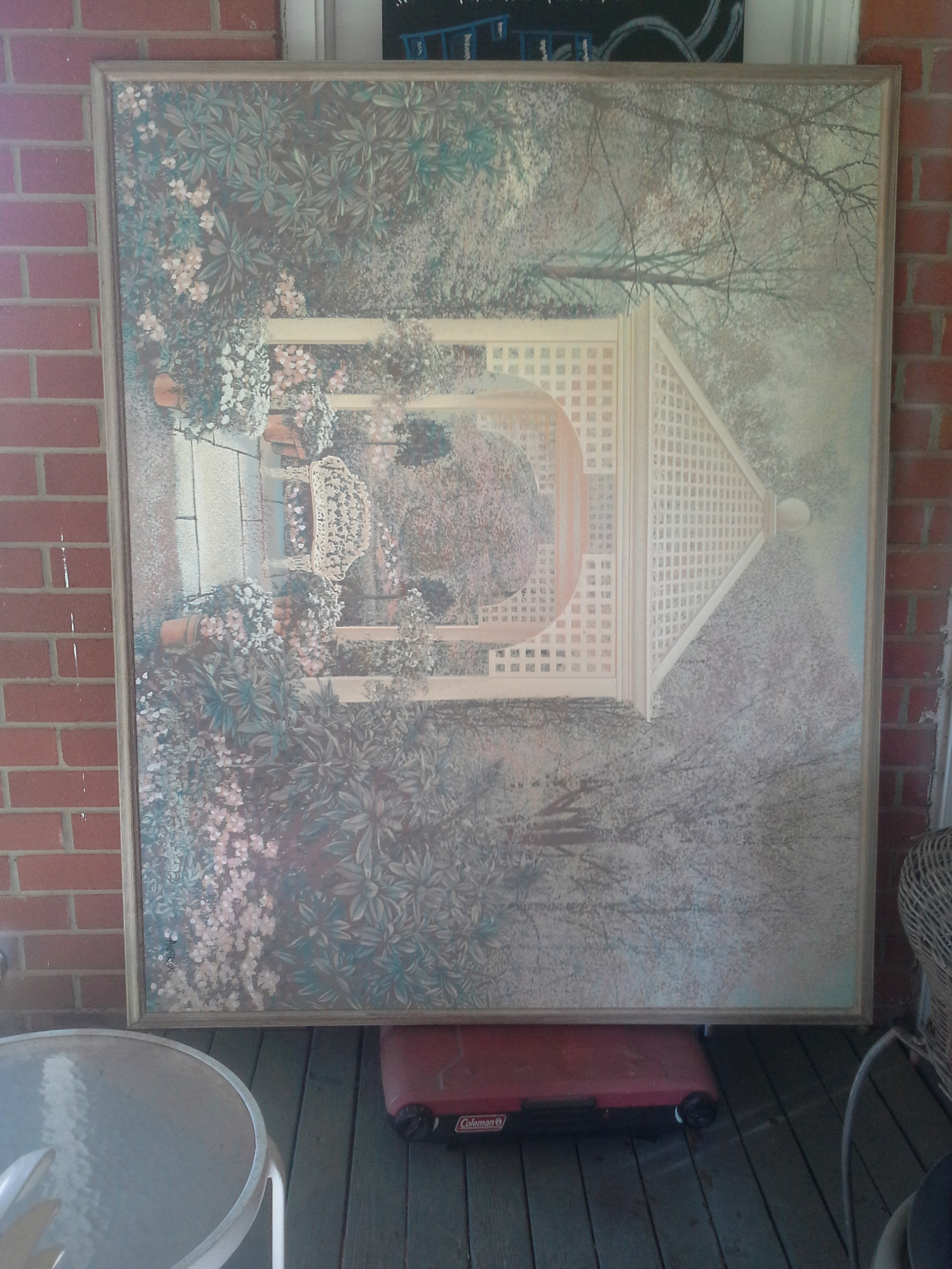 My wife ( http://www.melodysaccone.com ) let me know about a juried art show coming up that is accepting submissions. The theme of the show would be Upcycling. Recycling garbage or other waste(garbage sounds terrible haha) into works of art, so I was gonna finish painting my door, or maybe turn in one of the crazy sci-fi guns that I’ve made, but then I saw this huge, ugly painting near a dumpster in our development. It was perfect.